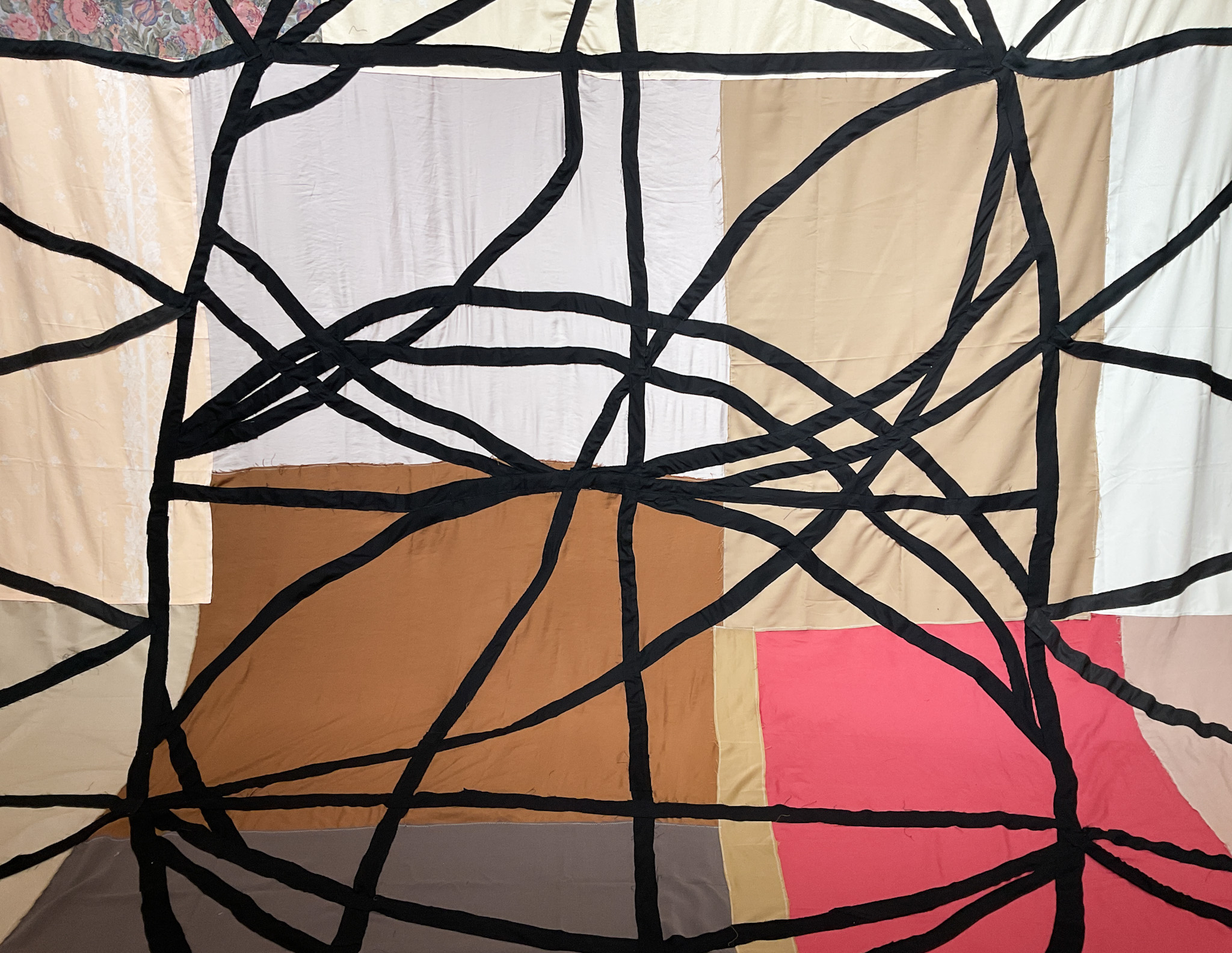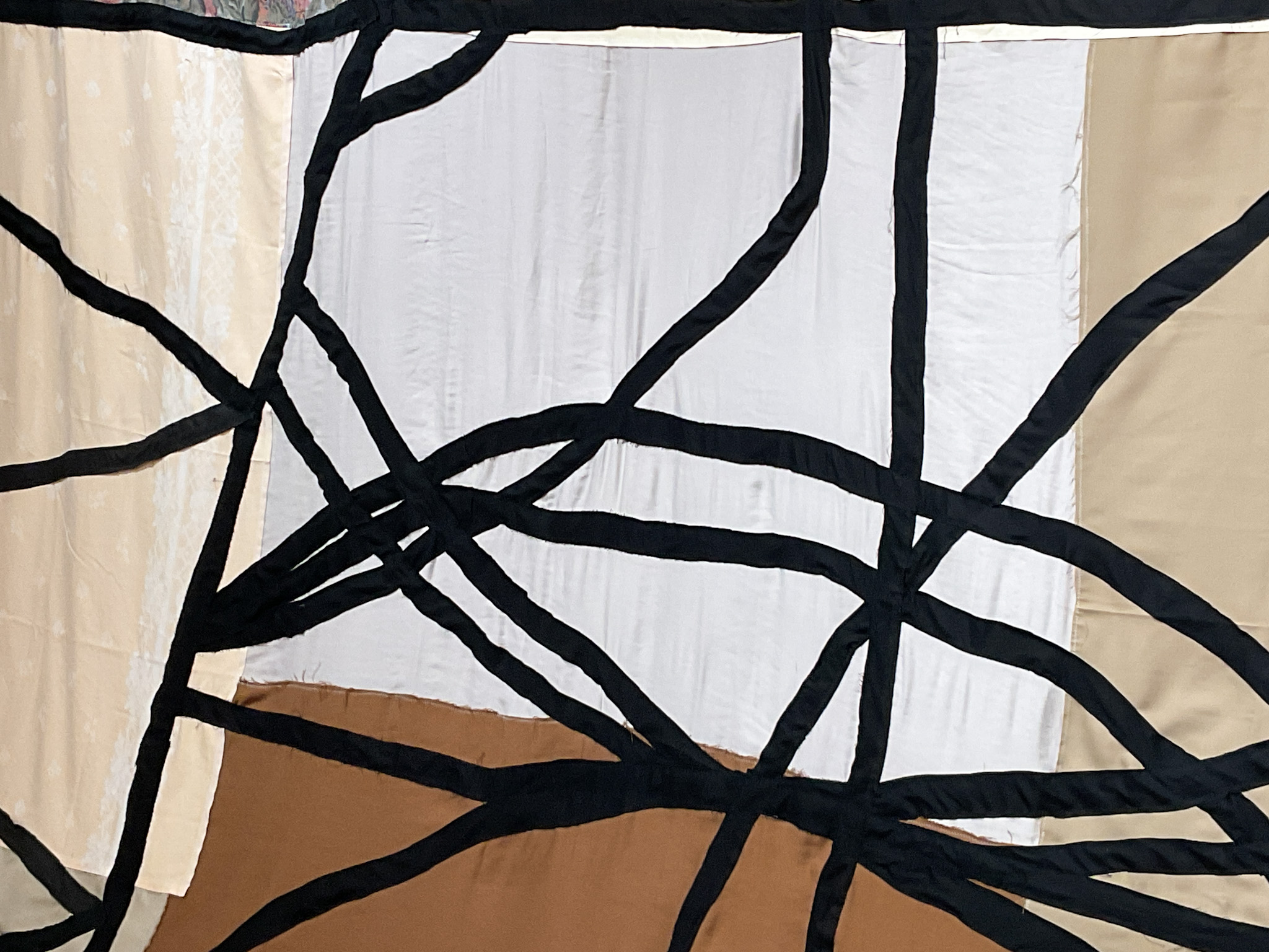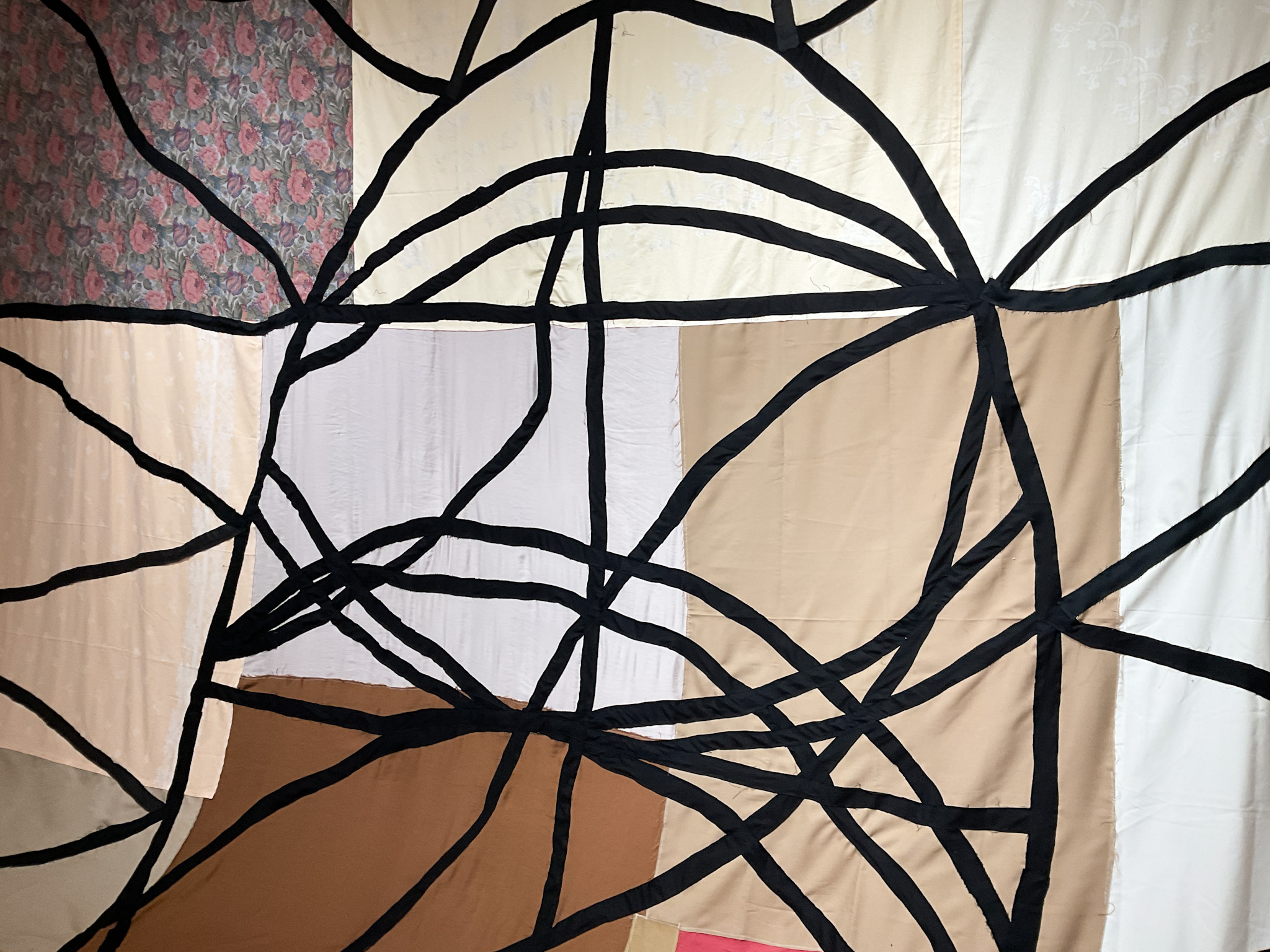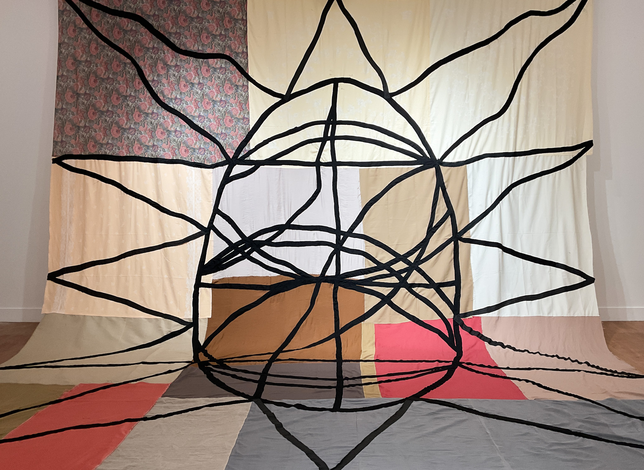 Signe cousu avec et sur du tissu récupéré, 5,5x5m, 2025.