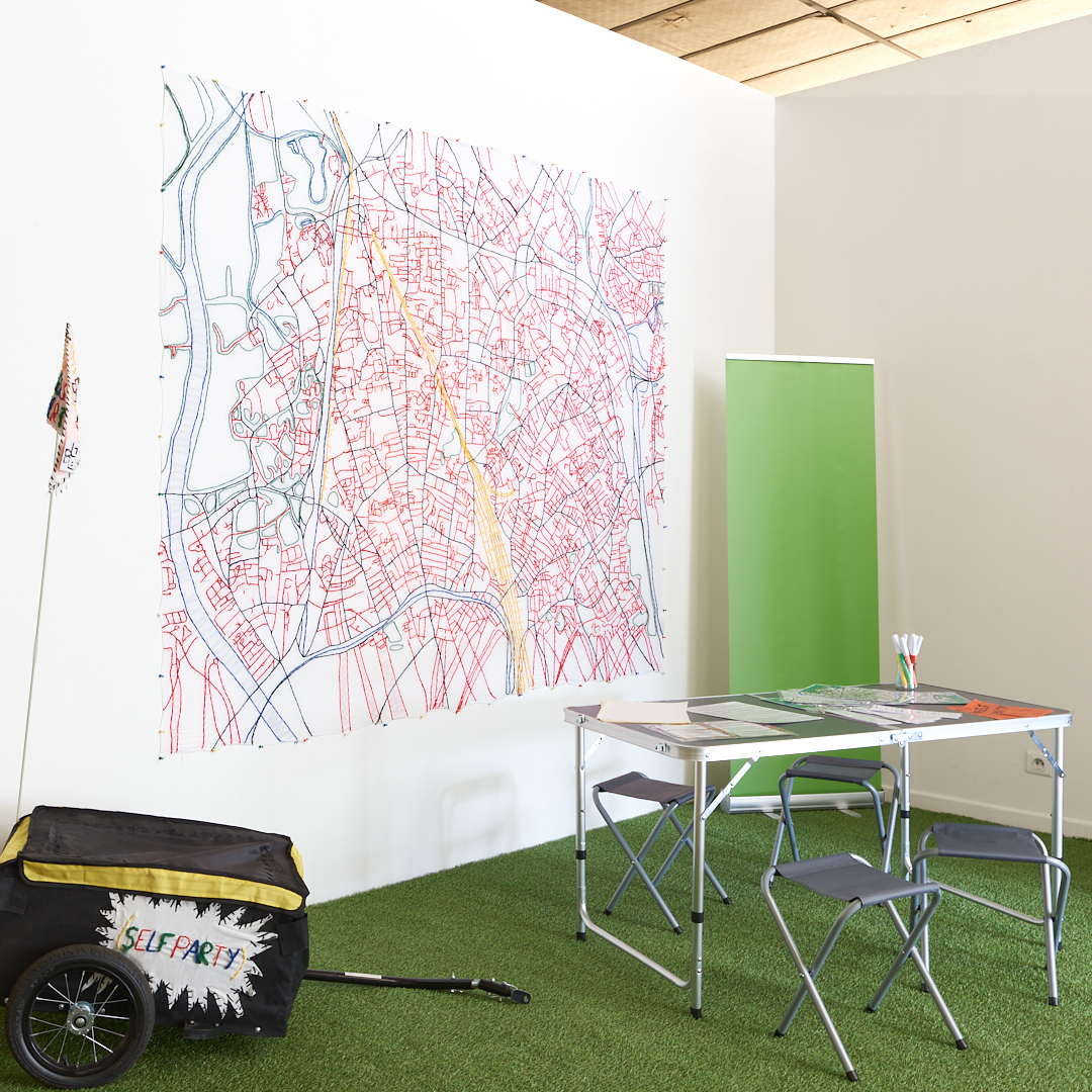 Win my real, pour perdre mes fantômes / Gagner mes fantômes, to lose my real est la cartographie des quartiers Nord de Toulouse que j’ai brodé chaque nuit durant quatre mois, en parallèle de la résidence de territoire Self Party. Ayant vécu 7 ans dans les quartiers Nord de Toulouse, le titre de cette pièce fait écho à ce nouveau rapport que j’ai tenté de tisser avec ces quartiers, tout en considérant mon passé et ses protagonistes. La résidence était itinérante et marquée par de nombreux trajets à vélo. Je m’amusais à reproduire les tracés que j’avais pu faire la veille avec mon aiguille, le lendemain avec mon vélo, afin d’éprouver physiquement, mais de deux manières différentes ce territoire anciennement familier et nouvellement étrange.