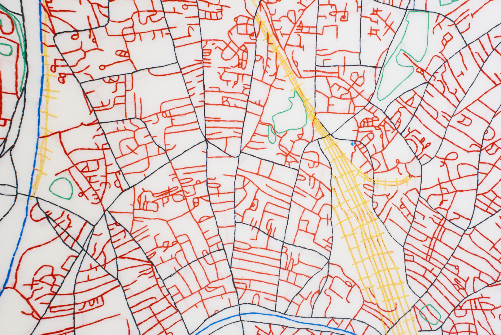 Cartographie des quartiers Nord de Toulouse brodée sur un drap chiné, 170x230cm, 2024.